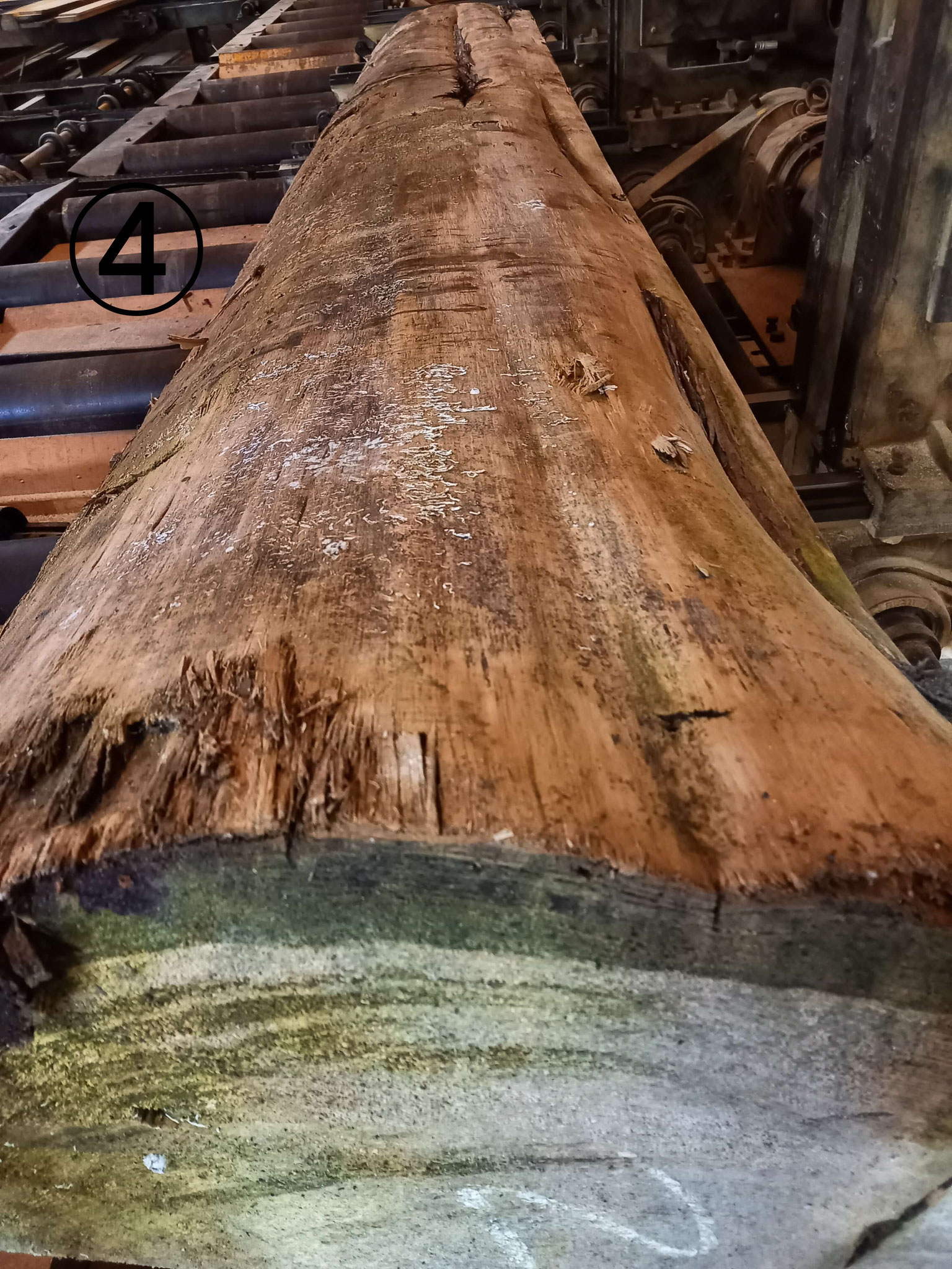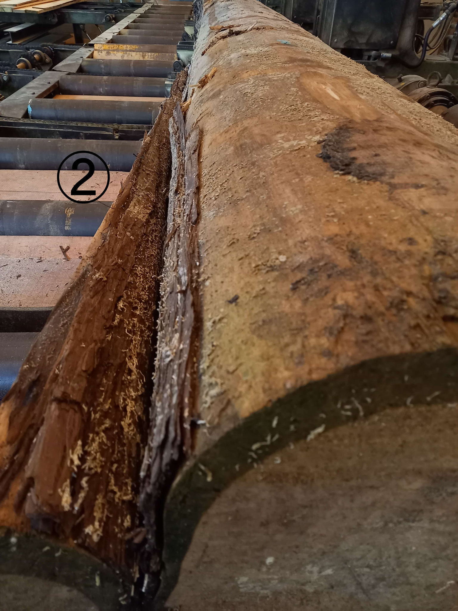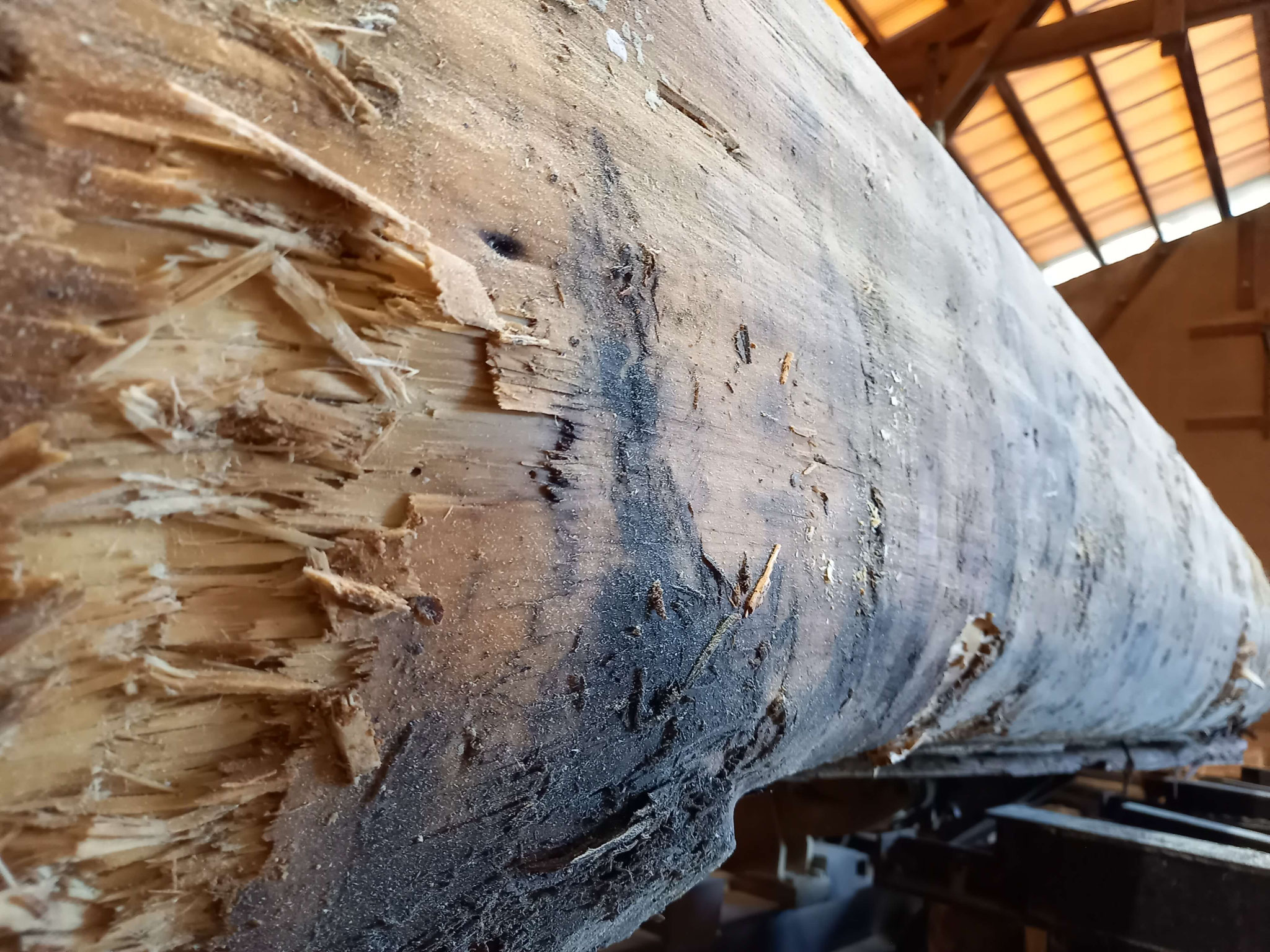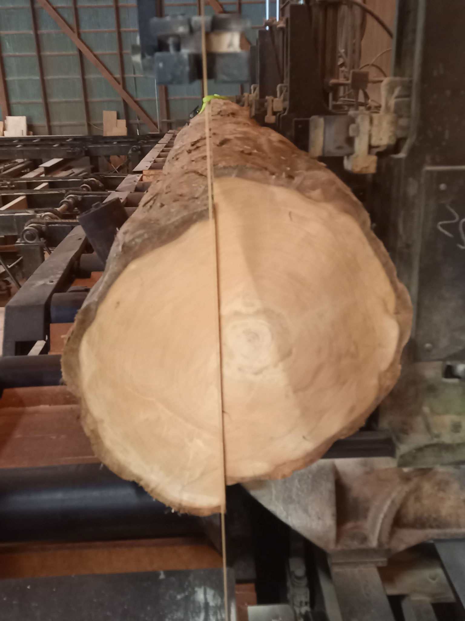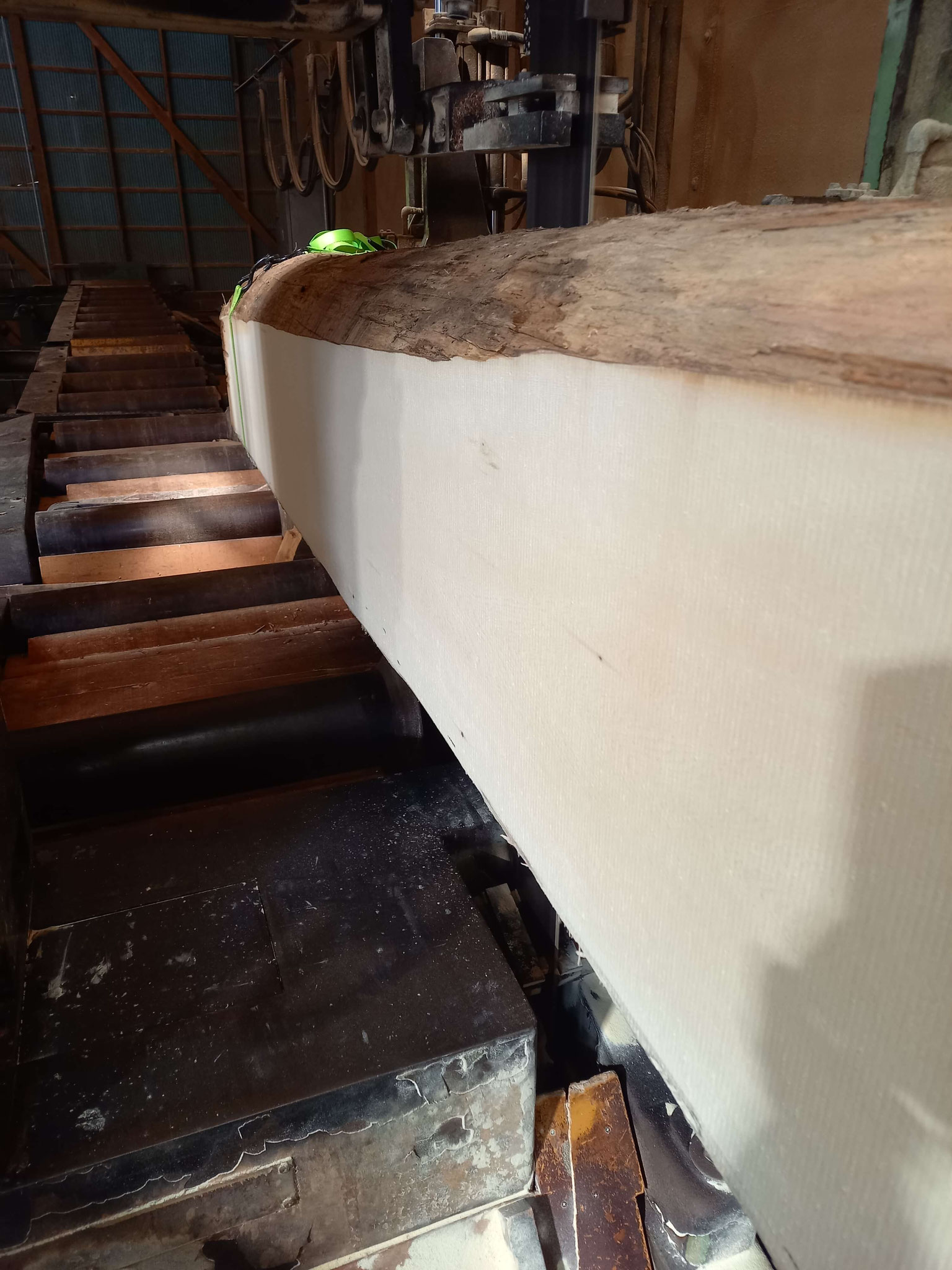さて今月の写真は、破風板用のバチのある丸太をホンキで製材したカットです😄
