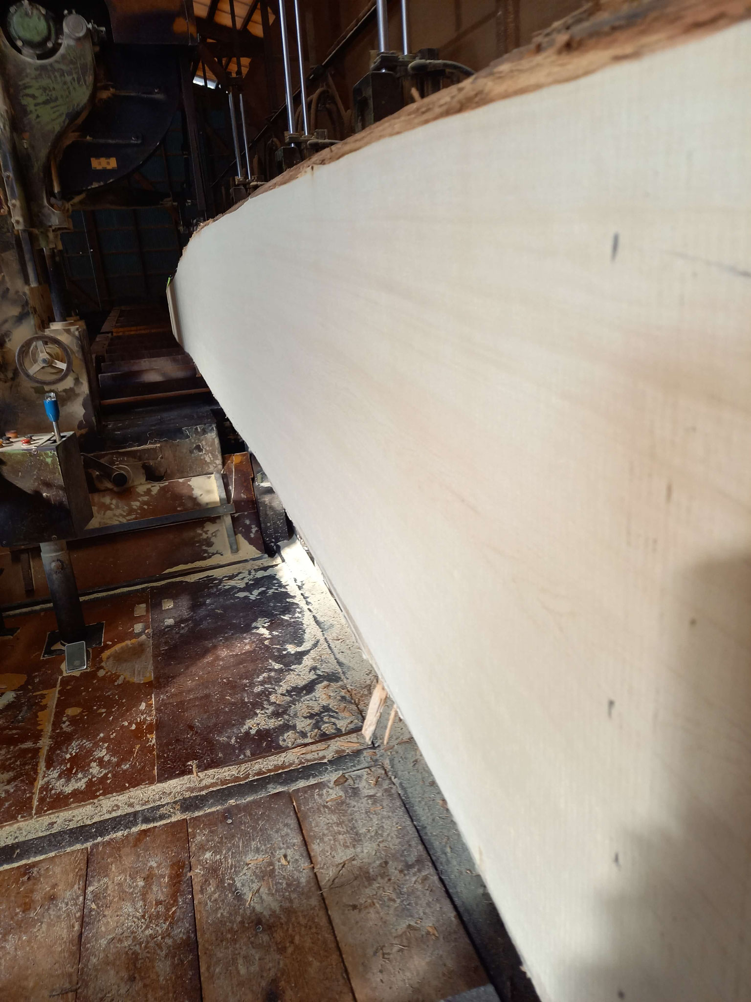 しかし外側だと小さくなっちゃうので大きく曲がった丸太を”ホンキ”で挽くんです😄