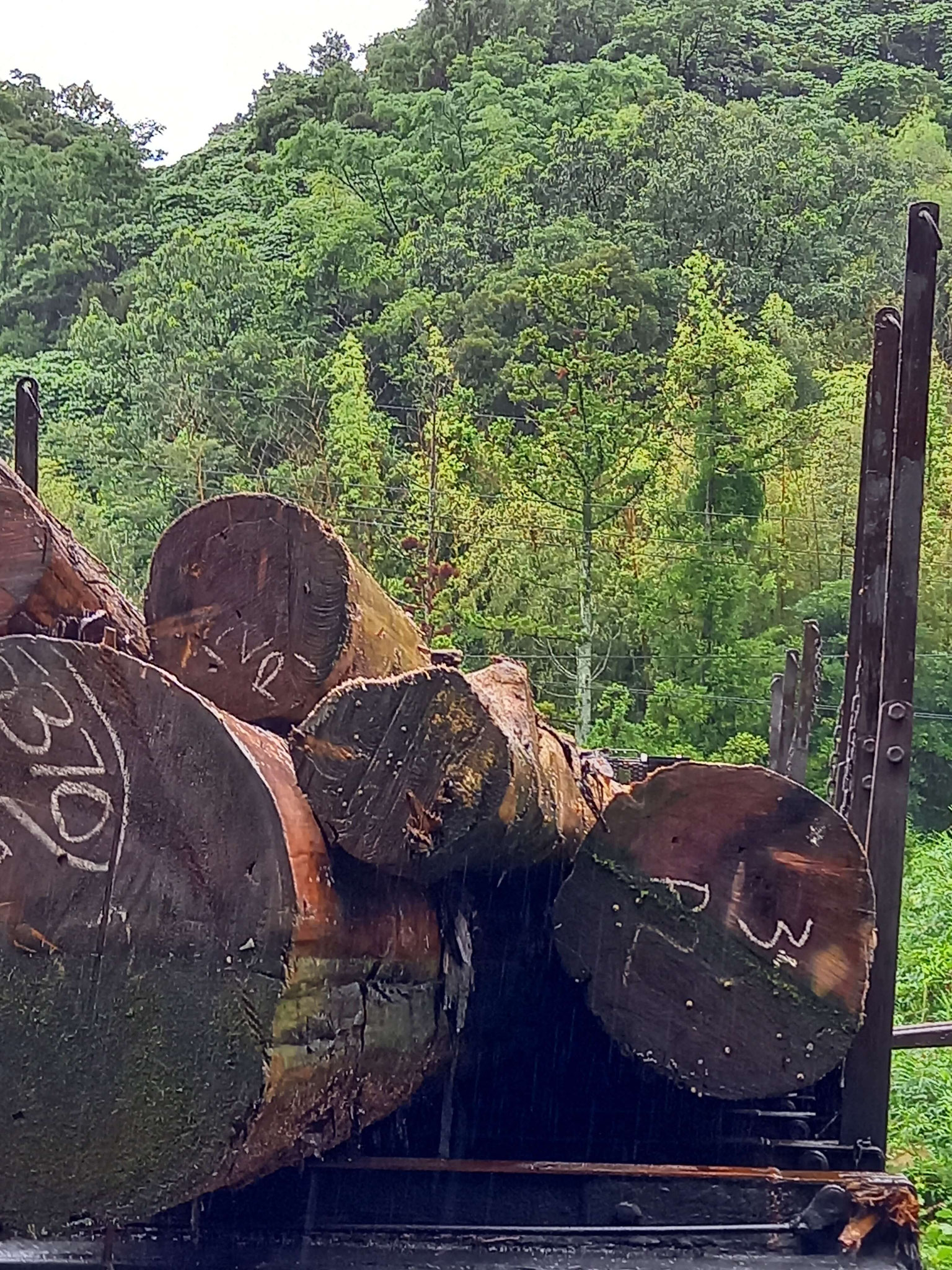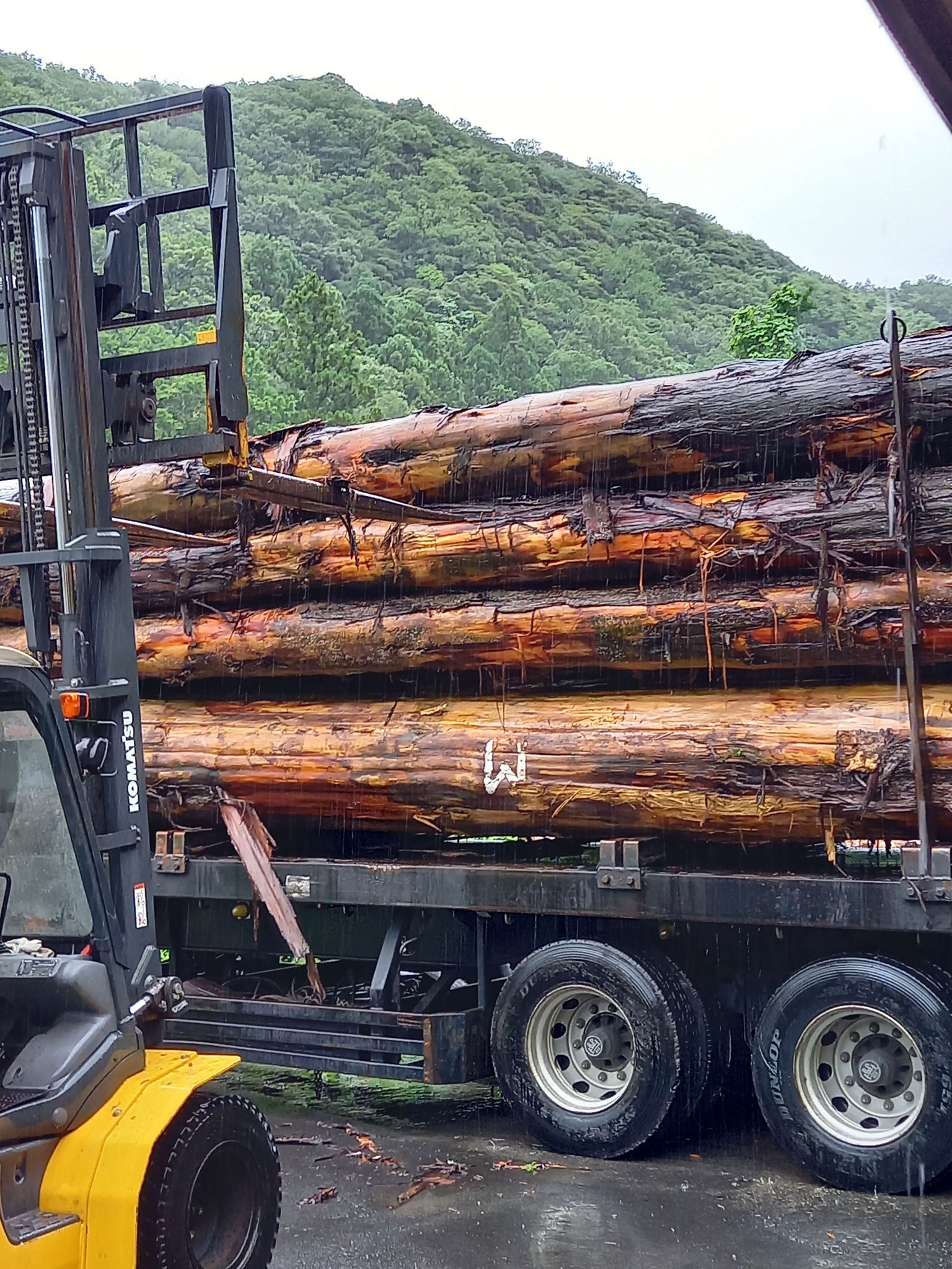 さて、今月の原木入荷日は、大雨洪水警報が発令されている中での荷下ろし風景のカットです😱