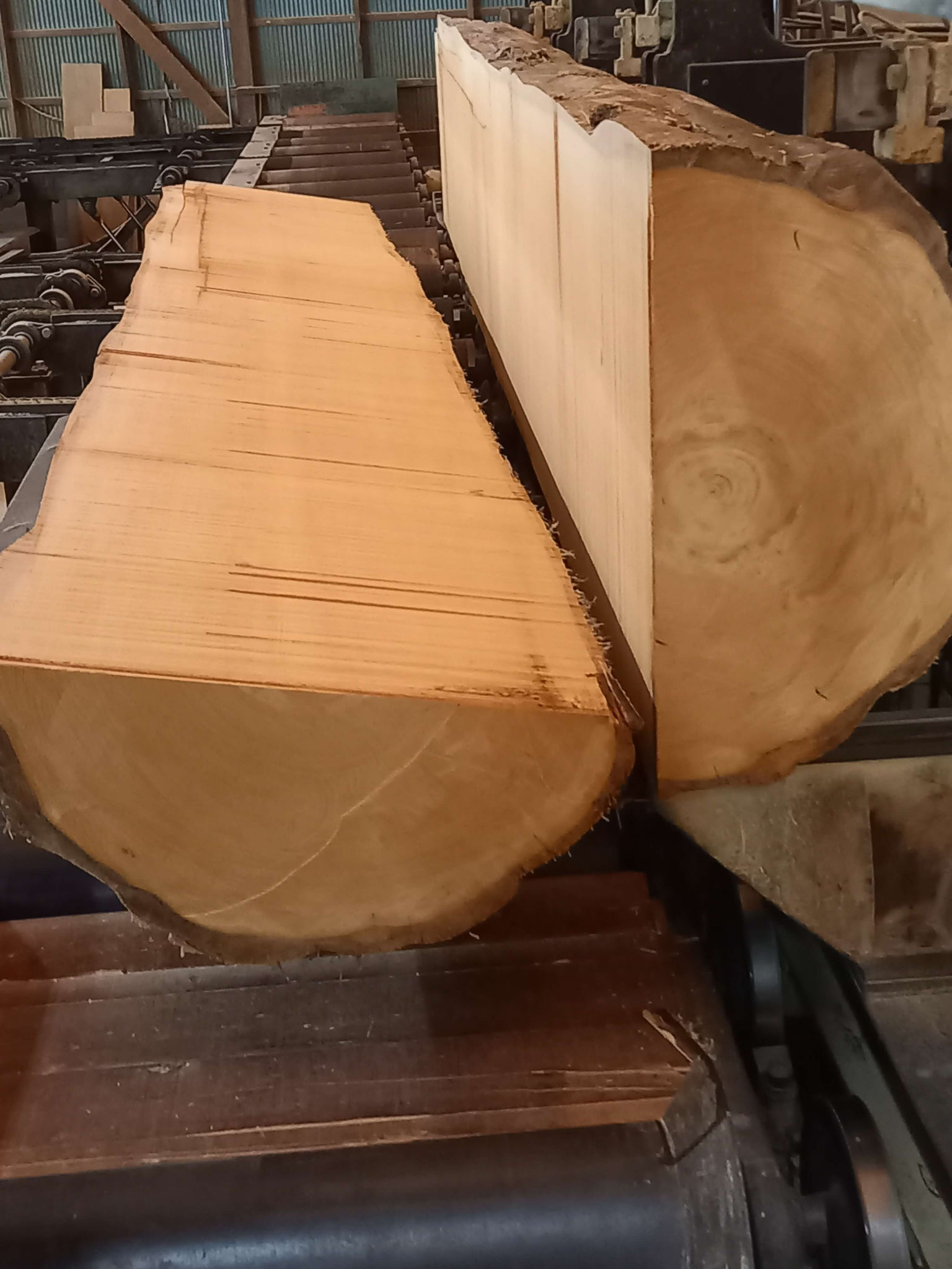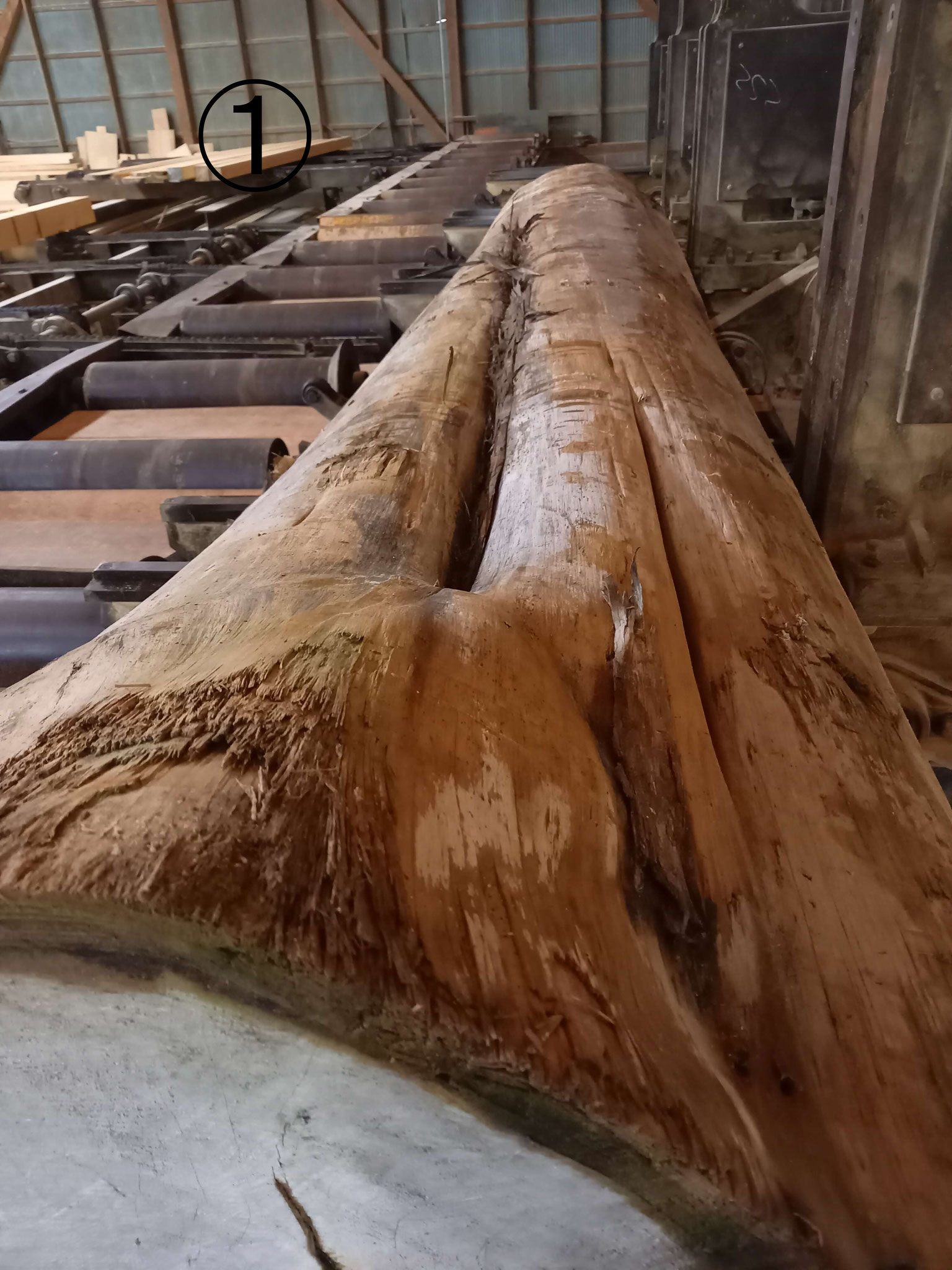 ホンキで製材すると、膨らんだ方(背後)は節が出やすいんですが、これはいい木でしたね😄