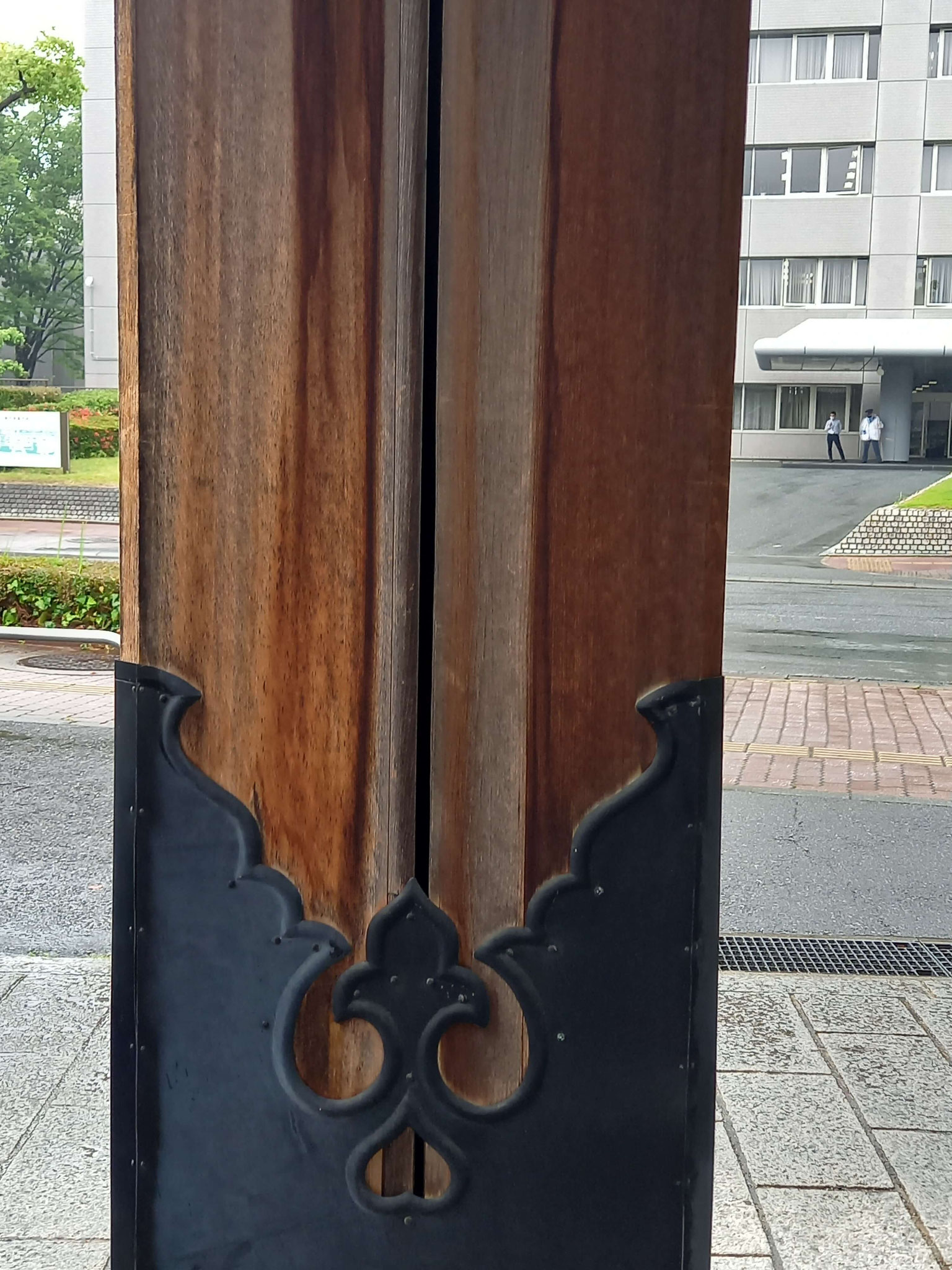 弊社が何十年も前に納めさせて頂いた、福岡県警本部前にあるベイヒバで建築された門です😄