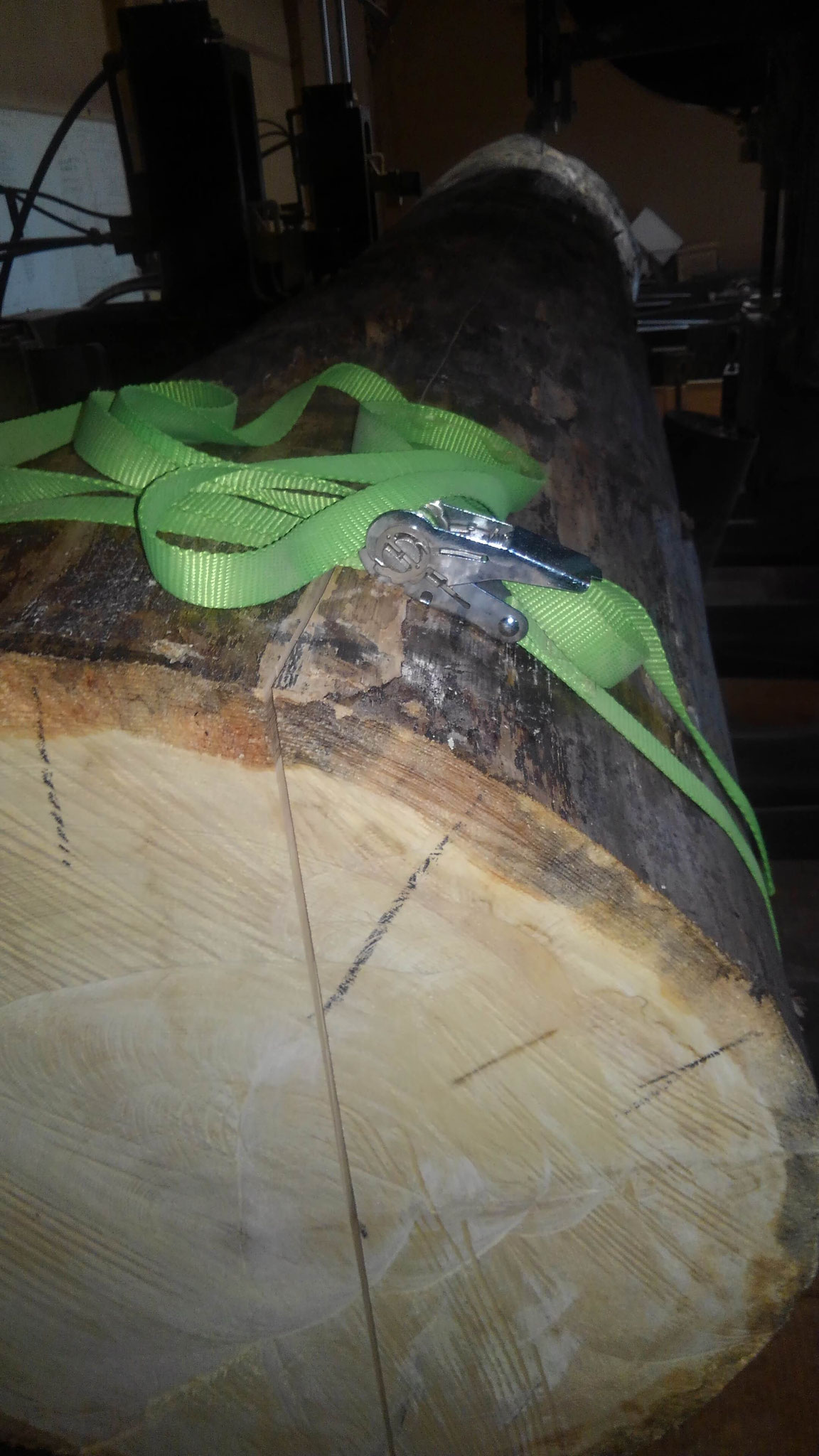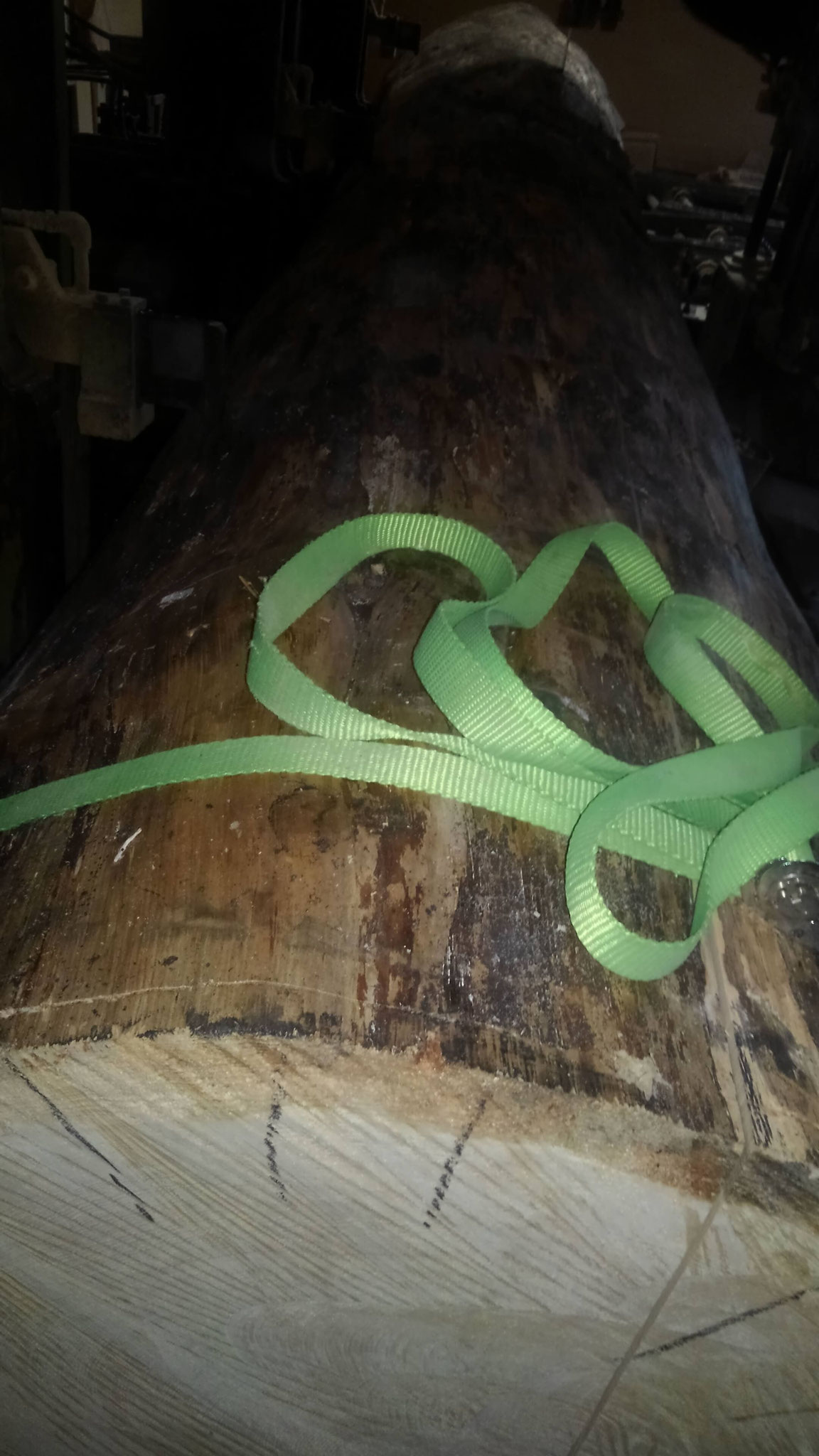 さて、今回の写真はFacebookでも投稿したんですが、大きな丸太を半割にしたときに、重さで丸太が鋸を噛んでしまったり、本機側に丸太が倒れ身動き出来なくなるのを防ぐ為に、昔は番線で縛っていましたが、最近ではこうしてバンドで縛っています😄