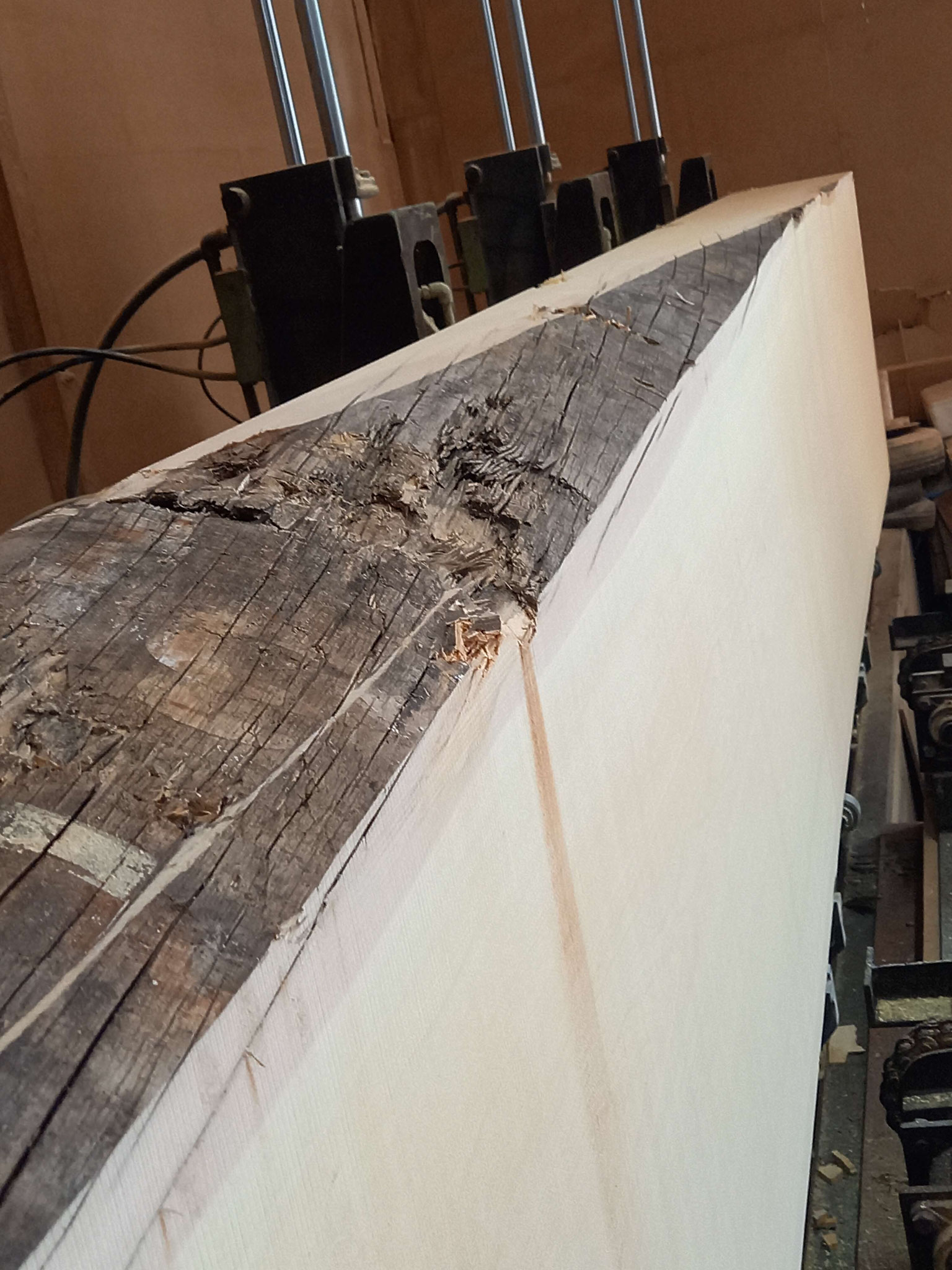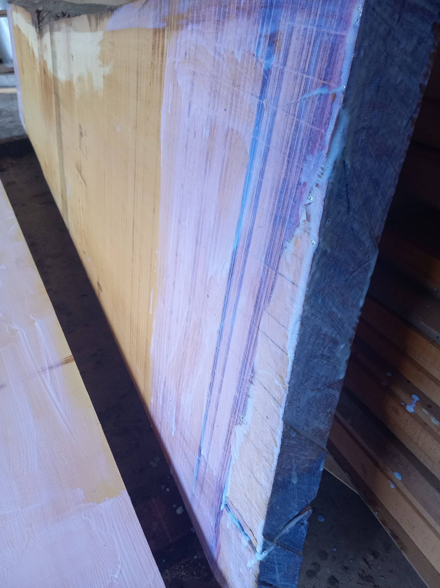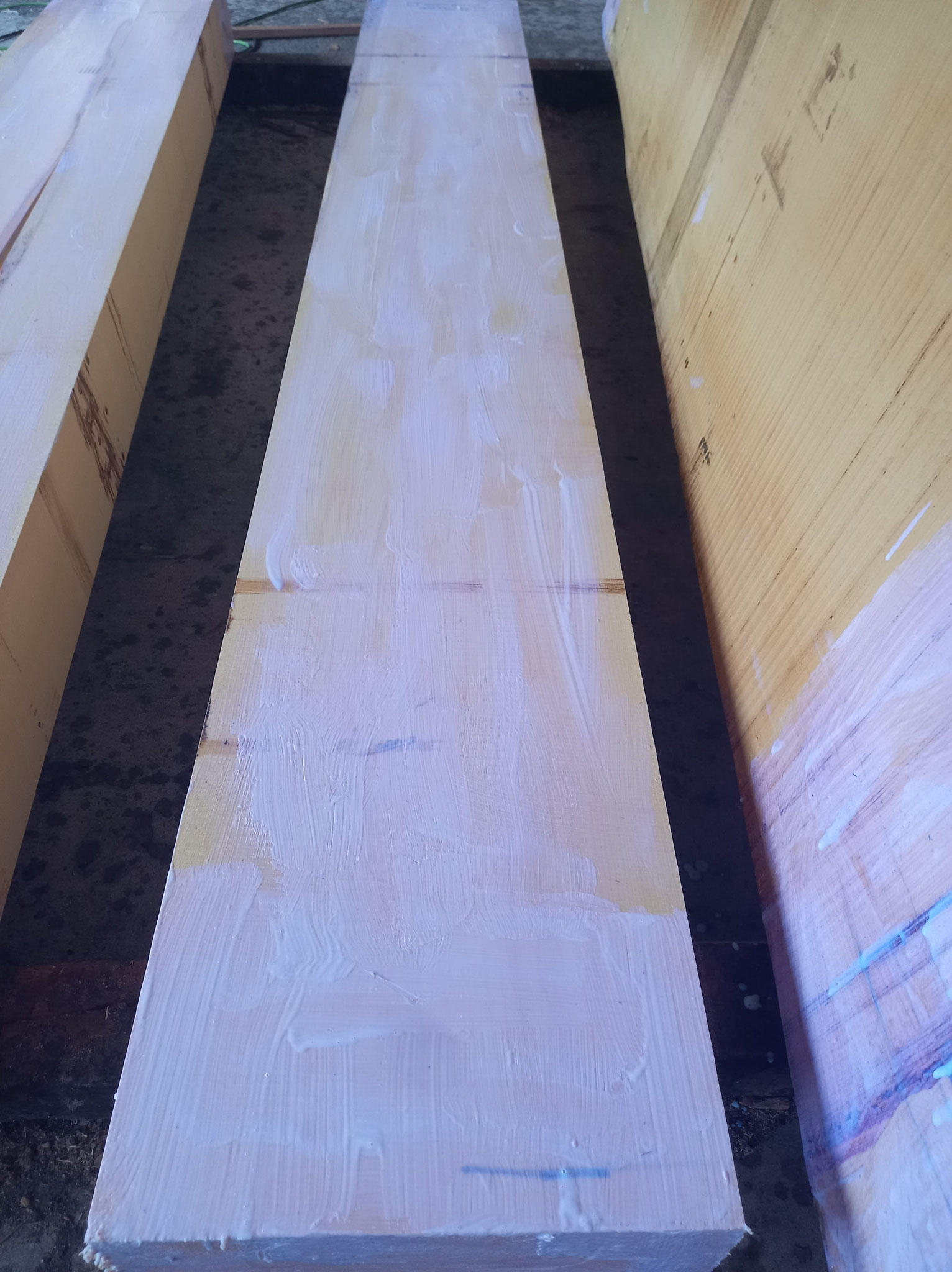 小口面30cmのみと、表面の杢目部分のみボンドを塗っていますが、何年も実験した結果、これが一番木材に負担をかけずに乾燥できます。